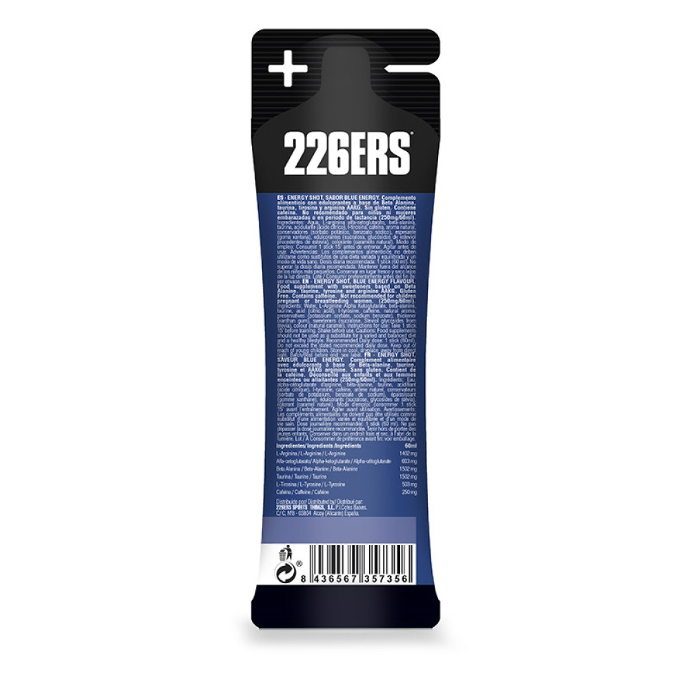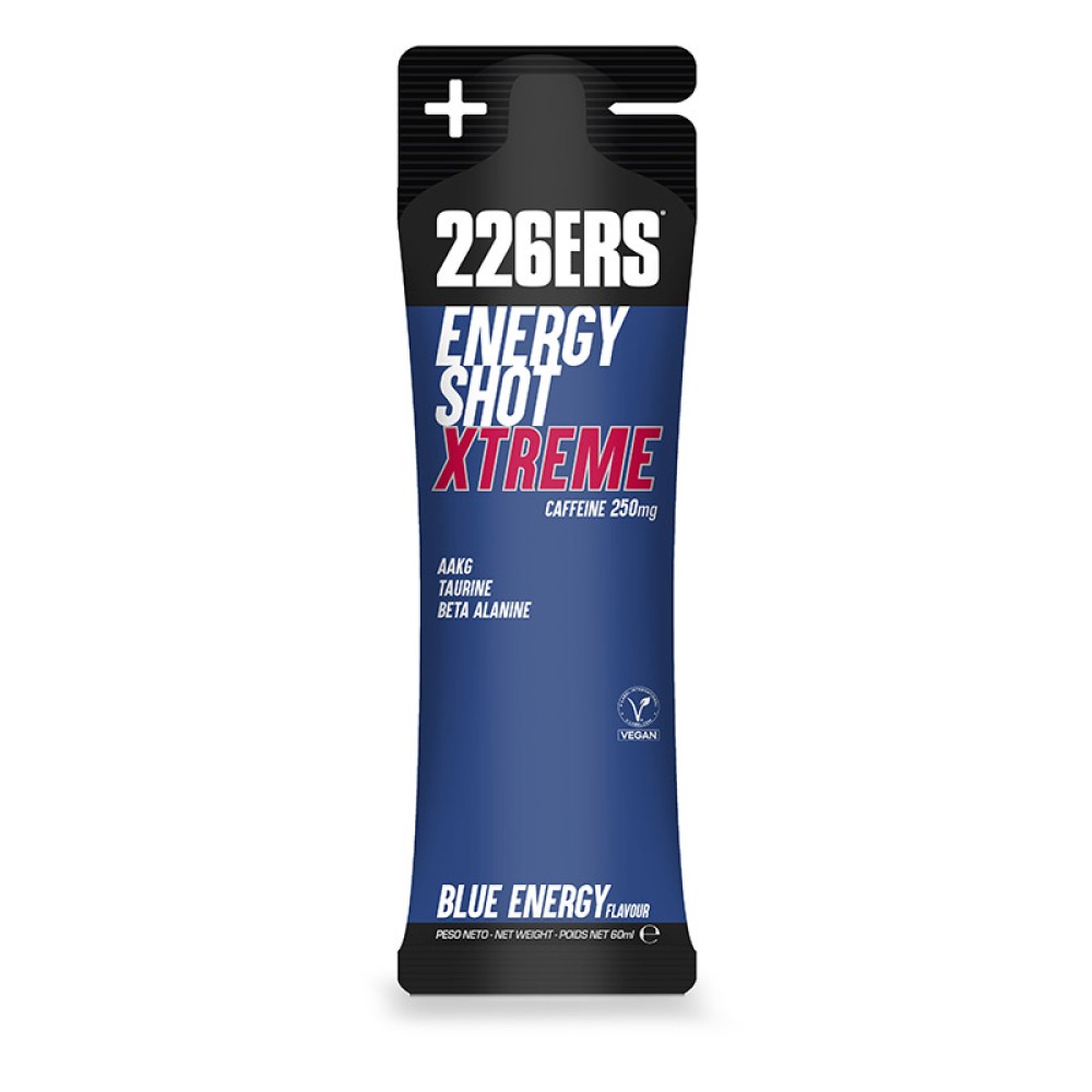 BLUE ENERGY XTREM con 250mg de cafeína. Shot energético en formato stick de 60 ml, apto para veganos y sin gluten. Formulado con 5 ingredientes específicos para producir una activación antes del ejercicio o para esos momentos en los que nos encontramos cansados y necesitamos activarnos. Complemento alimenticio a base de Beta Alanina, Taurina y Arginina. Algunos sabores contienen Cafeína (125 mg o 250mg/60ml). Contiene edulcorantes. No recomendado para niños ni mujeres embarazadas. Energy shot es un producto con textura líquida de 60 ml, formulado con ingredientes específicos para mejorar el rendimiento del deportista y reducir la fatiga durante los entrenos y las competiciones.