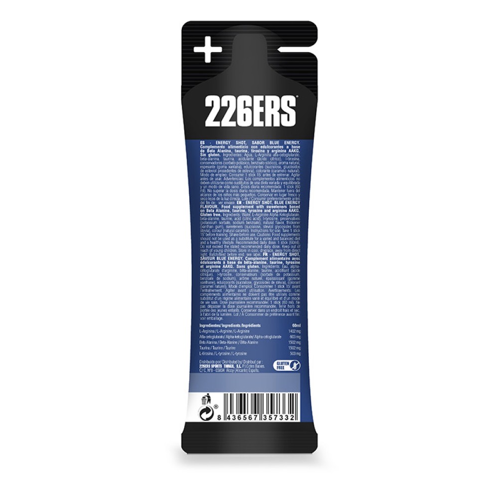 BLUE ENERGY ZERO sin cafeína. Shot energético en formato stick de 60 ml, apto para veganos y sin gluten. Formulado con 5 ingredientes específicos para producir una activación antes del ejercicio o para esos momentos en los que nos encontramos cansados y necesitamos activarnos. Complemento alimenticio a base de Beta Alanina, Taurina y Arginina. Algunos sabores contienen Cafeína (125 mg o 250mg/60ml). Contiene edulcorantes. No recomendado para niños ni mujeres embarazadas. Energy shot es un producto con textura líquida de 60 ml, formulado con ingredientes específicos para mejorar el rendimiento del deportista y reducir la fatiga durante los entrenos y las competiciones.